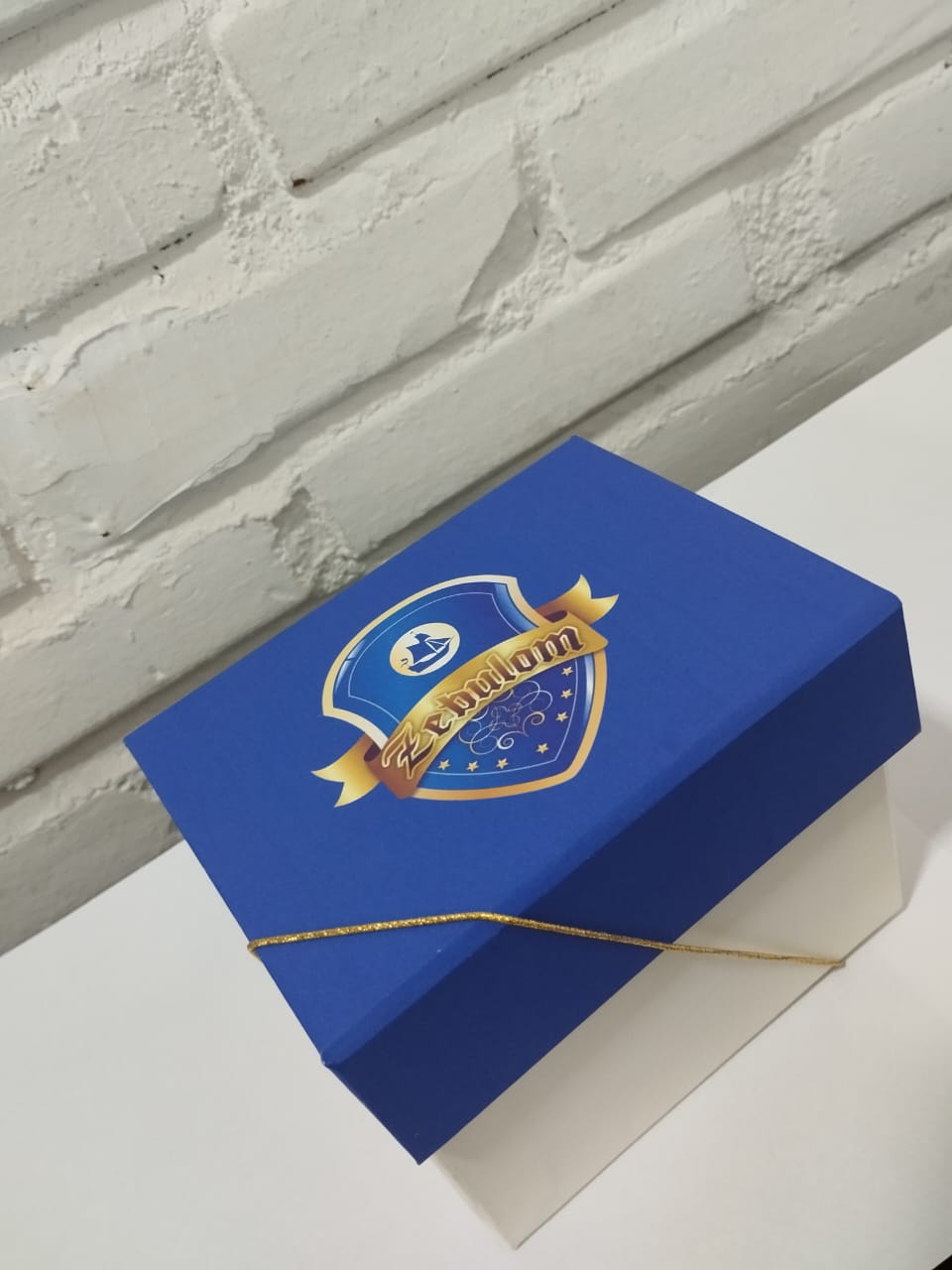 Caixa cartonada. Medidas 12X10. Material: •Papelão Hollber 1.9 gramatura. •Impressão da tampa com arte personalizada Zebulom. •Fechamento elástico dourado.